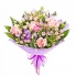 Гармоничная композиция из розовых кустовых и одиночных роз, фрезии и веточек эутомы, с добавлением зелени (фатсия) в упаковке.